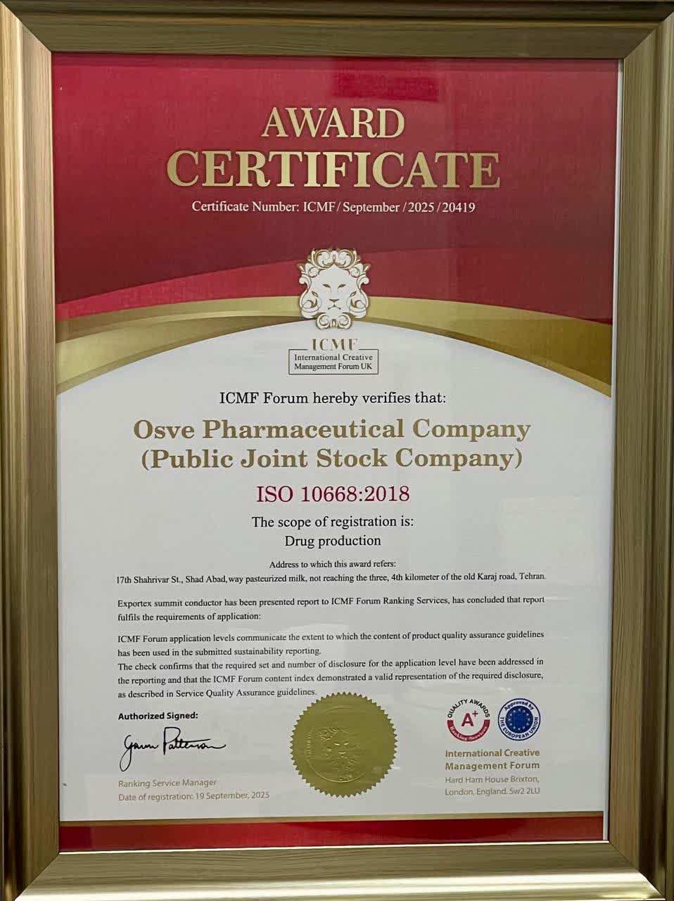 2. دریافت نشان واستاندارد بین الملل ( 10668:2018 ISO) ارزش برند محصولات دارویی از سوی اتحادیه اروپا