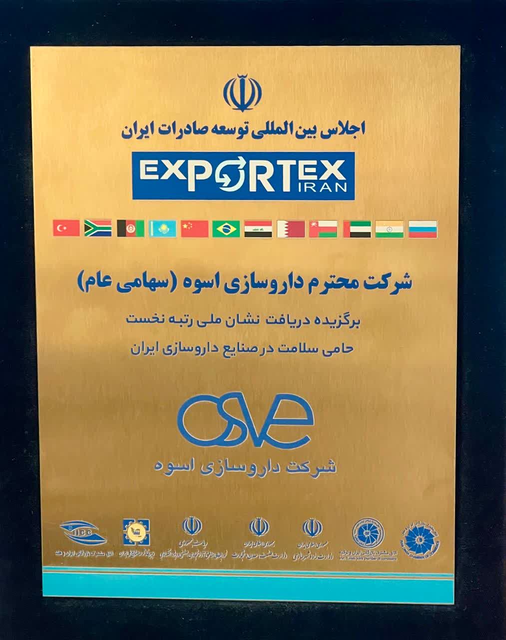 شرکت دارو سازی اسوه در"اجلاس بین المللی توسعه صادرات ایران" استراتژیهای توسعه خدمات، تولیدات و صادرات شرکتهای ایرانی، موفق به کسب سه نشان برتر در حوزه سلامت شد.